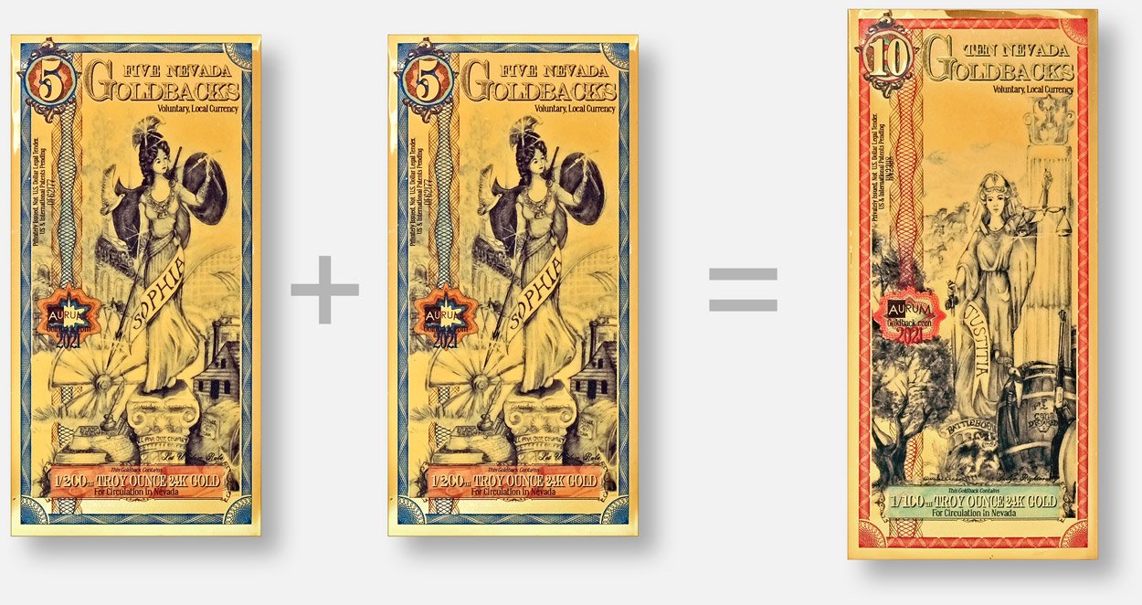 Or five Ten-Goldbacks notes for one Fifty-Goldbacks note.